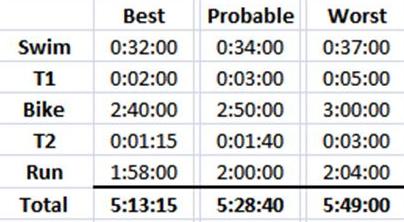 As I assess how I think I'll do in this weekends Half-Iron Distance triathlon, I have swung back and forth. About a month ago I suggested that I would end with a time of 5:50:00. Then I thought that I can't give under-training that much credit. So I had to break it down even more...and now I think "Wow, I am pretty screwed up." Here is my mind set along with my suggested best, probable and worst case scenarios.